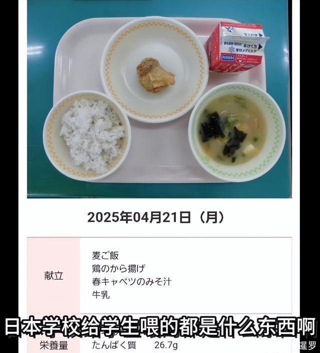 其实这事儿的核心,说白了就是日本某些人拿“虚头巴脑”的东西找优越感,却暴露了自家的真实短板——校餐实在太寒酸了。 咱们来看看日本学校的真实午餐水平:福冈市某小学2025年4月的午餐配置,每人289日元(约合14块多人民币),就一块60克的炸鸡、一小碗味噌汤、一碗米饭加一瓶牛奶,总热量才620千卡。 冲绳县更夸张,有小学的午餐居然是半碗米饭、一碗清汤加一条细沙丁鱼,被议员曝光后一天就有1500万次点击,日本网友全在吐槽“太少了”“孩子根本吃不饱”。
